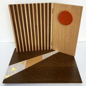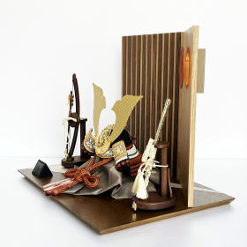 飾台には太陽の光が地面に差し込む様子を、三種類の和柄の模様でデザインしました。全体を茶色の木目調で統一した和モダンスタイルのお洒落な台・屏風です。