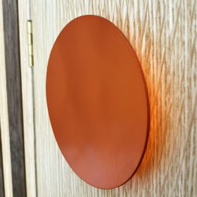 屏風の丸い金物は太陽に見立てており、LED照明付きで後ろからライト灯ります。インテリアを意識した縦格子からはオーク調の木目が覗き見え、奥行きを演出しております。