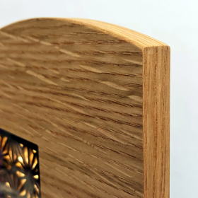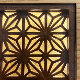突板加工で美しい天然木目を活かしながらブラウン色・白木色のツートンカラーに配色したお洒落な台・屏風です。背景の衝立板には、魔除けの意味を持ち縁起の良い文様「麻の葉」の組子細工とLEDライトを取り付けスタイリッシュなデザインに仕上げました。