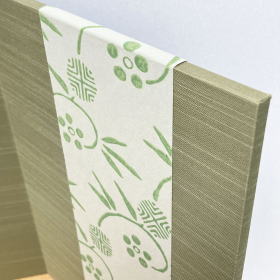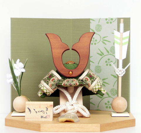 桃色がかった薄い褐色で光沢があるのが特徴で人気のある「シルバーハート」材を使用し突板加工で仕上げた 角形飾台に、松竹梅の絵柄の上品な「京唐紙」を帯状にデザイン貼りした屏風を合わせました。「龍村美術織物」を使用した萌黄色の木目込み兜と同系色の綺麗な屏風を合わせ、若葉の季節にぴったりのお節句飾りになっております。