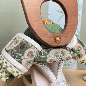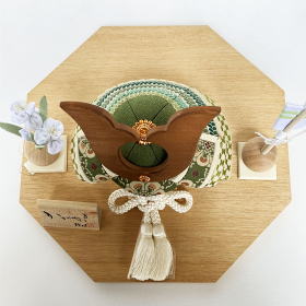 天然木目が綺麗な存在感のある鍬形や、上品な「龍村美術織物」(花鳥梅花紋)を贅沢に使用した吹き返しに、綺麗な薄萌黄色錣(しころ)が特徴的で、古代・中世の織物を復元させる「龍村美術織物」ならではの独特な絵柄や上品な生地感を感じて頂けます。コンパクトサイズの木目込兜ですが、素材や色彩にこだわり手間を掛け作られております。