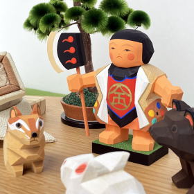 奈良時代に起源をもち受け継がれてきた精緻な彫刻技術、伊予「一刀彫」で製作された南雲作・金太郎とお供達を合わせた当店オリジナルセットでございます。