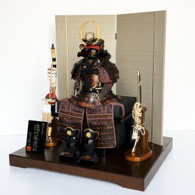 光沢感のある独特の色合いでシンプルなデザインされた屏風ですが、アンティーク調に仕上げた存在感を放つデザイン甲冑が良く合います。