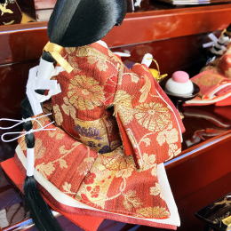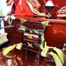 コンパクトサイズですが、艶のある塗り物のお飾り台、華やかな西陣織衣装、