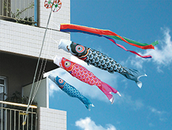 | マンションやコーポ等のベランダに最適です。鯉のぼりの他に、矢車、ポール、取付金具等の部品をそろえたフルセット。 |
