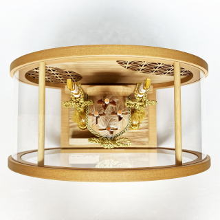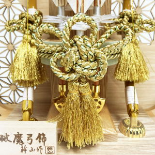 綺麗な茶ぼかし染めを施した4本の矢羽根には、「青龍」・「白虎」・「玄武」・「朱雀」の四神を示し、東西南北の魔を除ける方位除けの意味があります。天然木を使用した木製の弓飾りや飾台金色と緑色で組み上げられた綺麗な組紐など、温かみのある配色が綺麗です。お洒落なデザインで小型化が進む現在の住宅環境に適した円型デザインが人気の破魔弓飾りです。