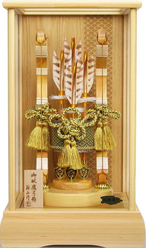 本体もケースも全て国産の「天竜桧(ヒノキ)」を使用した総桧造りで高級な破魔弓飾りでございます。高級感漂う桧ケースのバックは、古くから大変縁起の良い吉祥文様「青海波」柄をレーザー彫りし仕上げました。