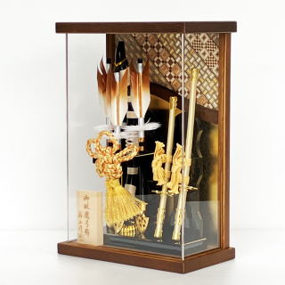 綺麗な茶ぼかし染めを施した4本の天然羽根には、「青龍」・「白虎」・「玄武」・「朱雀」の四神を示し、東西南北の魔を除ける方位除けの意味があります。綺麗な艶を出して黒塗りされたシックな飾り台・弓飾りに力強い二本太刀を配したお洒落なデザインで小型化が進む現在の住宅環境に適したコンパクトさが人気の破魔弓飾りです。