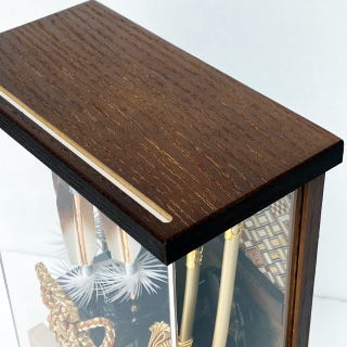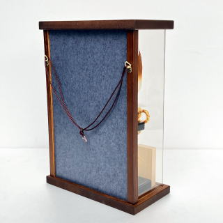 天然木目が綺麗な硬材として知られる「タモ材」をケース木枠に使用し、特殊な技法で木を寄せ伝統文様を作り出す日本伝統工芸の箱根「寄木細工」をケース背景にあしらった奥行き9cmの薄型な額飾り・置き飾り兼用のアクリルケースです。
