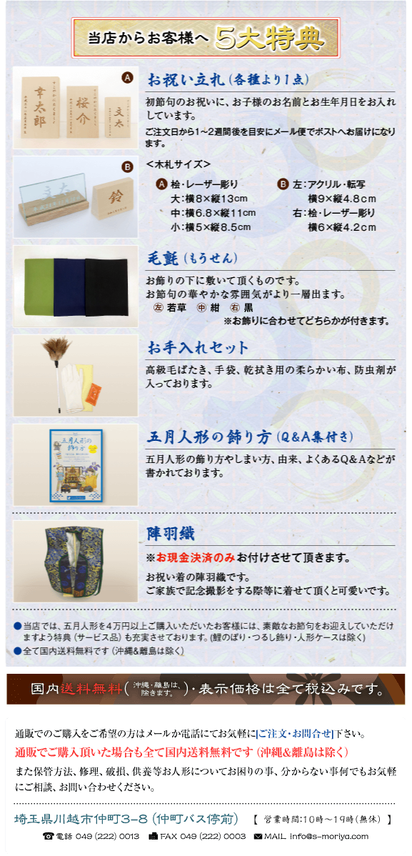 東昭齊秀月モリヤ人形店では、心をこめたお祝いの品である五月人形を末永くお飾りいただきたいと願っております。そのため特に、保証、修理等のアフターケアも万全に対応させていただいております。