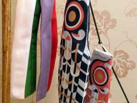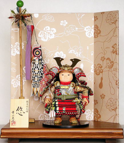 天然木目の美しい「タモ材」と「京唐紙」を使用した高級感漂う上品な台・屏風に、色彩の美しい紺糸褄取威しが特徴的な鎧着人形と可愛らしい鯉のぼり飾りを合わせた当店オリジナルセットでございます。