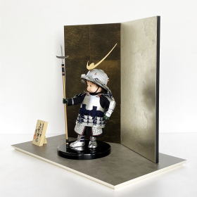 | 「壱三」作、本格派の銀色鎧を身にまとった凛々しくも愛らしい 、もののふ童「剣舞・上杉」平飾りセットでございます。 何処かで見たようなと目を引く、身近にいる子供達をモデルに人形師「壱三」が製作した童人形。一文字に葉をくいしばった可愛らしい表情のお顔と、三俣の槍を手に勇ましいポーズを決めた人形の躍動感のある造形が特徴的です。 軽量かつ整備の簡易性から鎌倉時代後期以降好んで制作されたといわれる「筋兜」を再現した六十二間筋兜と上杉謙信特有の月と太陽を模した日月前立や、甲冑整備の簡易・便利性や防御力と生産力を向上させる為に考案された大型の金属板=伊予小札を正絹黒糸で吊り造られた素懸(すがけ)威し等、甲冑師「雄山」が本格的で完成度の高い甲冑を製作しました。 甲冑師「雄山」と工房「壱三」のコラボレーションで製作された限定生産品「もののふ童シリーズ」の鎧着人形です。 とても小さなお人形ですが、身に付けた本格派の甲冑や表現力豊かな人形の造形は見事で、一見の価値があります。 マットな質感が洗練された印象のダークグレー色の飾台に、黒貝箔調の上質な生地と上品な輝きを放つ銀箔紙を使用しツートン配色されたモダンなデザイン屏風を合わせました。 ツートン配色のデザインで高級感漂う屏風に、本格派の銀色鎧に身を包んだ可愛らしくも勇ましい上杉謙信之鎧着人形を合わせた当店オリジナルセットでございます。 ※「筋兜」とは、鎌倉時代後期から南北朝時代頃に発生した兜。兜本体を形成する鉄板を接ぎ留める鋲をを見せず、鉄板の縁をねじり立て接ぎ目を筋状に見せたもの。通常の兜(星兜)に比べ軽快・軽量かつ製作整備が簡易であるため、好んで用いられました。 ●こちらの商品の特典(サービス品) ・サービス品@緑色の毛氈(もうせん) ・サービス品Aお手入れセット ・サービス品Bお節句説明書 ・サービス品Cお子様のお名前入り立札 ・サービス品D陣羽織(お子様に着せて頂くと可愛いです) ・国内送料無料です(海外への送料につきましては有料になります) |