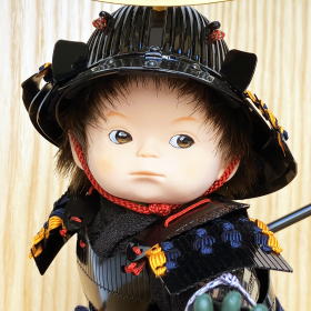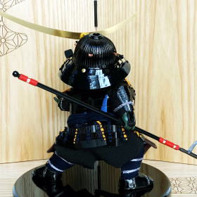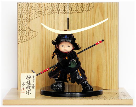 「壱三」作、本格派の黒い鎧を身にまとった凛々しくも愛らしい、もののふ童「政宗・参上」平飾りセットでございます。