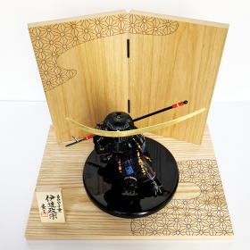ナチュラルで淡い色と、場所によって色の深さが異なる木目の美しさが特徴的な「タモ材」を使用した台・屏風に、本格派の黒い鎧に身を包んだ勇ましい伊達政宗之鎧着人形を合わせたオリジナルセットです。