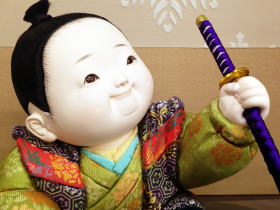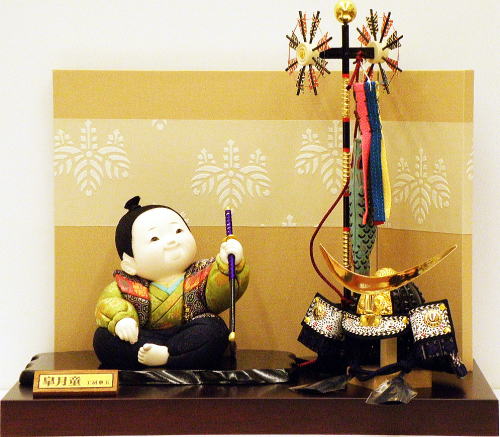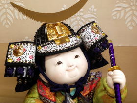なんとも言えない優しいお顔立と上品な正絹衣装に、着脱可能な兜飾りを合わせた遊び心ある創作的な木目込人形でございます。