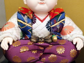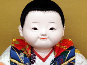 ふっくらしたほっぺにつぶらな瞳で笑みを浮かべている愛くるしいお顔立ちと手や足の表情にまで気を遣い躍動感溢れる造形が特徴的な人形です。