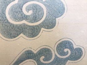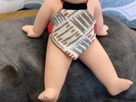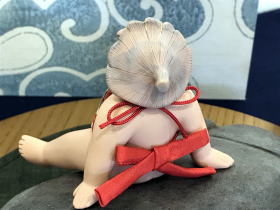 お空を見上げ微笑んでいるお顔が可愛らしい金太郎は胡粉で仕上げ、かわいい腹掛を掛けました。