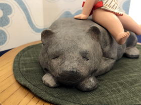 何とも言えない優しい表情を浮かべ寝そべる熊は、黒く染めた和紙を貼り重ねて作りました。