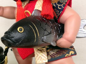 「真多呂」作、愛らしい木目込人形「金太郎」ケース飾りでございます。 ふっくらほっぺで口を一文字に結んだ誇らしげなお顔立ちが特徴的なお人形です。 兜を被り片手に大きな鉞(まさかり)、脇には活きの良い鯉を抱えている様は、明朗活発でたくましい金太郎を連想させます。 人形の作りで難しいと言われている腕や足などの裸体の造形も見事で、繊細な手足の指先の動き至るまでこだわり作られております。 丈夫で健康な身体を作りお子様が元気ですくすく成長するようにと願いが込められた金太郎を人形師「真多呂」が独自の感性で表現した躍動感あふれる木目込み人形でございます。 ・国内送料無料です(こちらの商品は海外への発送はできません)