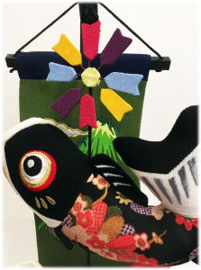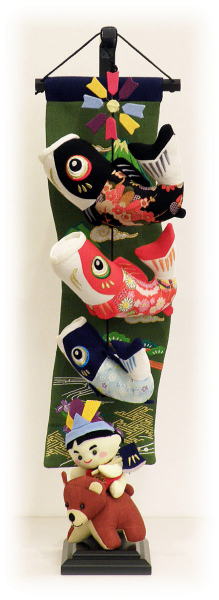 手触りの良いちりめん素材を使用した色彩豊かな鯉のぼり達が元気よく泳ぐ様が特徴的で、昔話の「金太郎」を可愛らしくデザインしております。