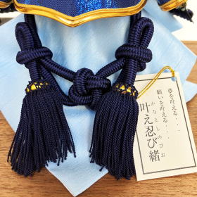 アルミ素材に綺麗な紺・青色の模様を転写プリントした上品な吹き返し、あえて紺一色で仕上げたシックな配色の威しや将来描く夢・希望が叶う願いが込められている「叶え忍び緒」も特徴的です。