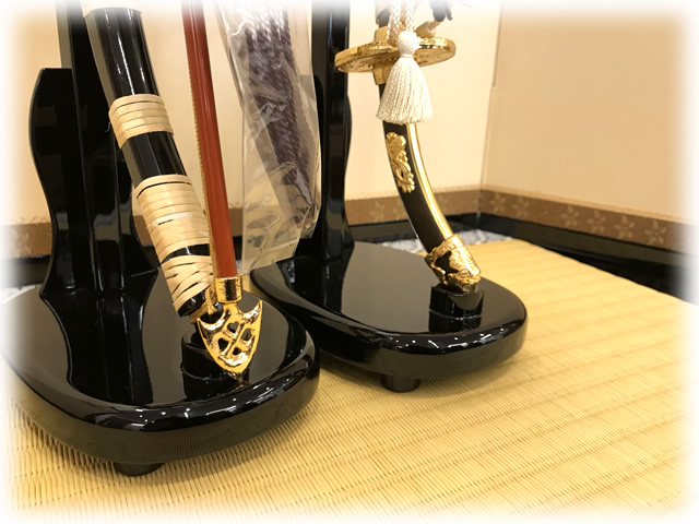 丁寧に重ね塗り仕上げた本畳み付き黒塗り台に、上品な二重ヘリと豪華な金具付の「本仕立屏風」を合わせました。屏風には末代まで子孫繁栄・家系が末長く続きますようにと願いが込められた縁起の良い「松葉」の絵柄が金彩蒔絵で大胆に描かれております。美しい金彩蒔絵が豪華な手作り屏風に、名匠「加藤鞆美」が手掛けた本格派の兜が良く合います。