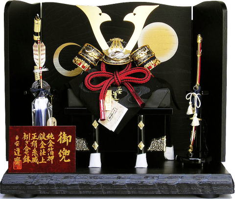 天然木目を活かしながら丁寧に黒塗り仕上げられた重厚感漂う台・屏風でございます。上部に湾曲加工を施したお洒落な屏風には、三日月(誕生・人生の出発)・満月(成長完成・望みが叶う)の絵柄がシンプルかつ大胆に描かれており、縁起の良い「月光」の金物が豪華な兜が良く合います。