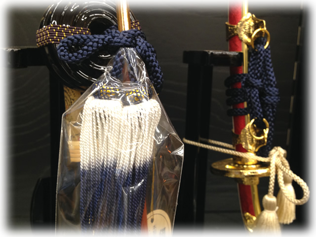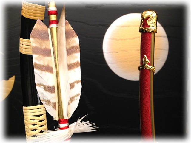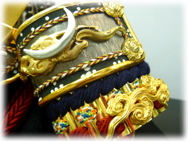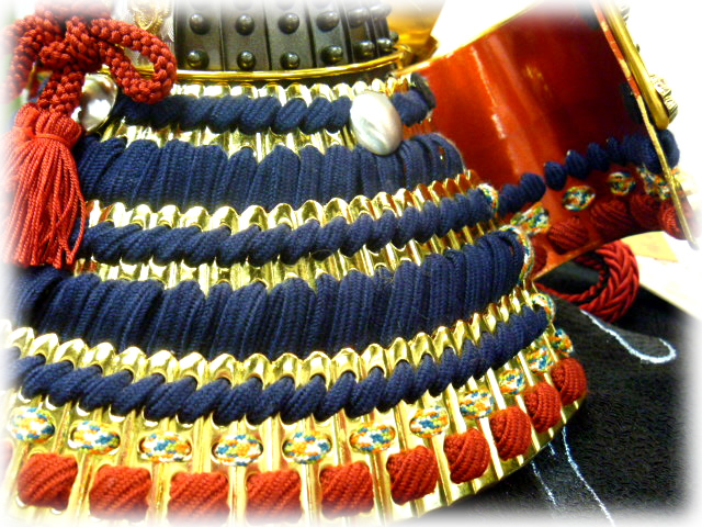 シンプルですが落ち着きのある紺色の正絹糸を使用した上品な威しには、三日月(誕生・人生の出発)・満月(成長完成・望みが叶う)・十日月(刈り入れ・収穫の時)の形を模った銀金物があしらい、威しに使用した小札は、金沢の純金箔を手作業で1枚1枚丹念に押しながら貼る純金箔押でしあげました。