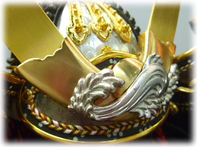 兜鉢はプレスして型抜きした抜き鉢ではなく、十数枚もの金属板を加工して一つ一つ手作業で鋲打ち止めて鉢を形成していく矧ぎ合せ鉢で、真鍮製の鍬形を使用し丁寧に鍍金された重厚な月光之金物を前立てと吹き返しへ使用した兜は、とても縁起が良く豪華な作りになっております。