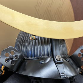 シンプルなデザインですが存在感のある装飾金物が豪華な台・屏風に、金鍍金の三日月前立が際立つ伊達政宗兜が良く映える当店オリジナルセットでございます。