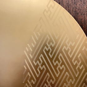 色の深さが異なる美しい天然木目が特徴で狂いが生じ難い硬材「タモ材」を突板加工し、落ち着きのある色調で重厚感のある焦げ茶色=ウォールナット調に塗装をして仕上げた衝立型のスタイリッシュなデザインの飾台・屏風です。屏風には、古くから家系の繁栄や長寿を願う縁起の良い吉祥文様「紗綾形」をデザイン彫りした円型の装飾金物を大胆にあしらっております。