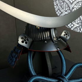 また兜の深いダークな色合いに綺麗な縹色の忍緒(組紐)を合わせひとつ上の上品さと高級感を演出しております。