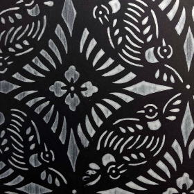 屏風は、金具を一切使わず木枠に和紙を何枚も重ねて造られる手造り「本仕立屏風」です。独特の質感と深みのある濃紺色が特徴の上質な和紙に、古くから厄をついばむとも言われ厄除けや家内安全・商売繁盛の象徴とされ縁起の良い「雀」を模した銀雀丸紋様の「京唐紙」をデザイン貼りした日本の伝統美を感じさせる屏風です。