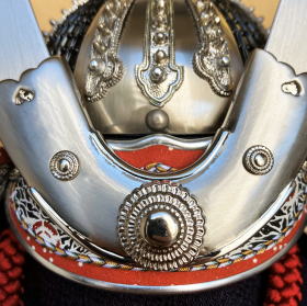 製造工程においては、プレスして型抜きする抜き鉢ではなく、数十枚もの金属板を加工して一つ一つ手作業で鋲打ち止めて鉢を形成していく矧ぎ合せ鉢や、密度が高くきめ細かい綺麗な正絹糸威しを造る為に極小ピッチ(間隔)で形成された極細小札の技法が駆使されており、通常の兜製作より多くの手間と時間をかけ丁寧に手作りされております。