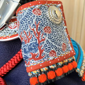 丁寧に銀鍍金された真鍮製の鍬形や本革を使用し現存する国宝兜と同じ絵柄を見事に再現した吹き返し、落ち着きがあり鮮やかな浅葱色の極上正絹糸を使用した美しい威しは特徴的で気品溢れる上質な作りになっております。