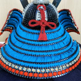 厳島神社所蔵の国宝兜を模写して作られた「雄山」作12号浅葱威之兜・収納飾りでございます。