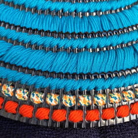 また、落ち着いた色合いでとても柔らかい性質を持つ極上正絹糸を使用した浅葱威之兜は、その糸の柔らかさ故、製作難易度が非常に高く希少価値の高い兜と言われております。