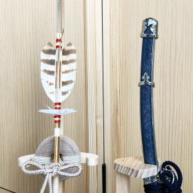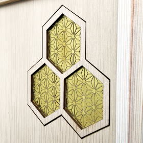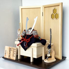 日本銘木の産地として有名な静岡県浜松市天竜区で育林されている良材「天竜杉」を使用した台・屏風です。屏風には、古くからお子様の健やかな成長を願いが込められている日本伝統の吉祥文様「麻の葉」柄を装飾しモダンデザインに仕上げました。渋い赤みを呈した艶やかな光沢が美しい銘木「天竜杉」を使用した高級感漂う台・屏風に、上品な浅葱色が際立つ国宝模写1/5浅葱威之兜が良く合います。