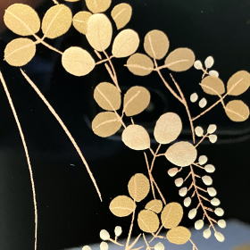 屏風には、秋の七草のひとつで優美な花とされ古来より愛されてきた文様「萩」を金彩蒔絵で上品に描きました。