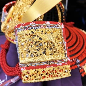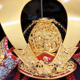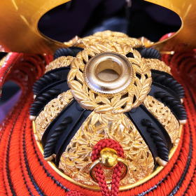 鍬形・金物は全て真鍮製で、本物の24金(本金)を溶かして塗り仕上げる24金鍍金が施されております。この24金鍍金された金物を兜鉢・吹き返しはもちろん眉差や鍬形台・しころ裾全体などに使用した豪華な総金物造りは、重厚感がありその輝きは格別です。