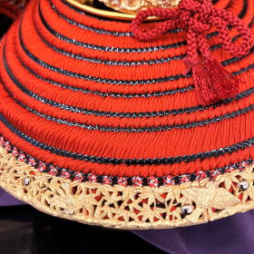 なかでも落ち着いた色合いでとても柔らかい性質を持つ極上正絹糸を使用した竹雀之兜は、その糸の柔らかさ故、製作難易度が非常に高と言われており希少価値の高い兜です。