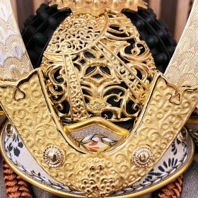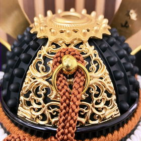 プレスして型抜きする抜き鉢ではなく数十枚もの金属板を加工して一つ一つ手作業で鋲打ち止めて鉢を形成していく矧ぎ合せ鉢や、綺麗に磨き本金(24K)鍍金された真鍮製の鍬形を使用しております。