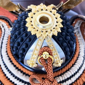 またプレスして型抜きする抜き鉢ではなく、数十枚もの金属板を加工して一つ一つ手作業で鋲打ち止めて鉢を形成していく矧ぎ合せ鉢や綺麗に磨き本金(24K)鍍金された真鍮製の鍬形・綺麗に研ぎ出し鍍金された重厚感漂う鍬形台を使用しております。