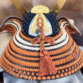 煙りで燻すことでなめし・色付けした鹿皮に様々な絵柄を型取り漆を刷り込んで造る高価な「甲州印伝革」を使用した吹き返しと、落ち着きのあり上品な色彩を放つ真朱という朱色の正絹糸で威された綺麗な正絹段威しが特徴的で高級感漂う兜です。