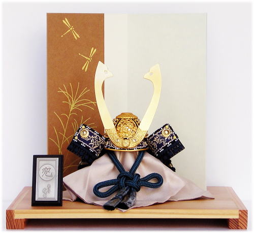 木目の美しい無垢杉飾台と手描き「トンボ」の優しい色合いの屏風に、古くから縁起の良い花として親しまれてきた「藤花」文様を模った「甲州印伝革」をあしらった上品な兜がよく映えるオリジナルセットでございます。