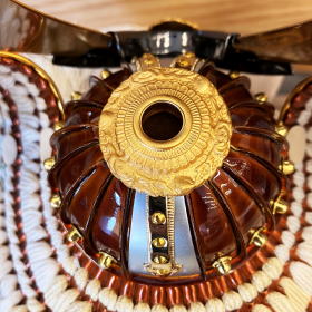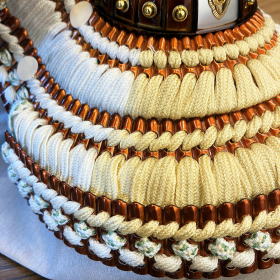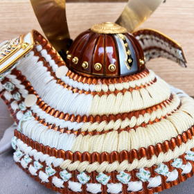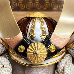 兜鉢はプレスして型抜きした抜き鉢ではなく数十枚もの金属板を加工し手作業で一つ一つ鋲を止めて鉢を形成する重鉢(合せ鉢)を使用し、本金を溶かし塗り仕上げる純金鍍金された真鍮製の鍬形を使用しております。
