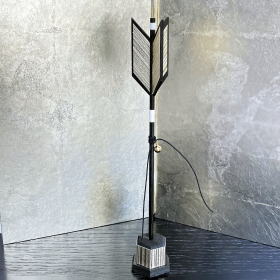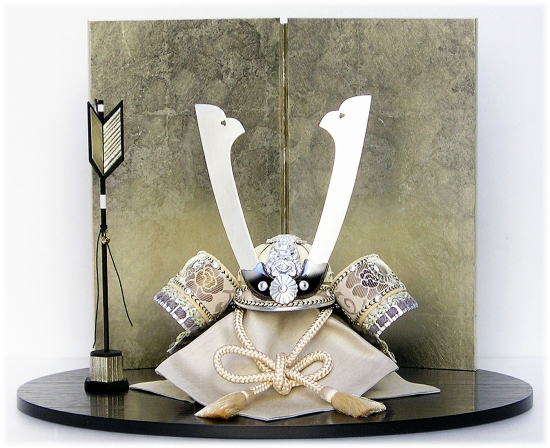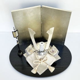 木目を活かし艶を消しの黒色に塗り仕上げた楕円型飾台に、箔の質感が綺麗な銀箔を包み貼りし仕上げた本銀箔屏風を合わせました。シンプルながら高級感漂う銀箔屏風に、上質な宝唐草文様の正絹帯地と綺麗な正絹威しが際立つ兜を合わせたオリジナルセットでございます。