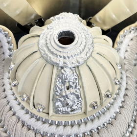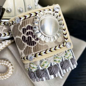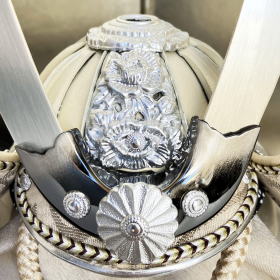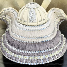 江戸時代の頃よりその伝統と技術を守り続け絹織物を製作し続けている京都老舗「誉勘商店」が手掛けた高級感漂う正絹帯地(宝唐草文様)を使用した眉差・吹き返しと、白とグレー色の正絹糸を使用し爽やかな色彩に威した綺麗な正絹段威しが特徴的で、二百七十余年の伝統技術で職人の手が織りなす絹織物と甲冑をコラボレーションさせた当店オリジナルの兜でございます。