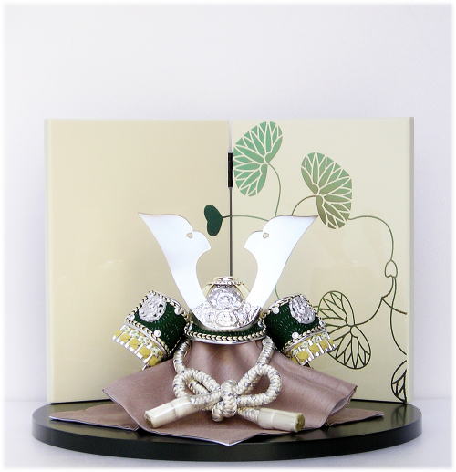 奥深い綺麗な深緑色に塗り仕上げられた円型飾台に、古くから幸先の良い象徴として縁起の良い「双葉葵」の吉祥文様が描かれた白色塗りの屏風を合わせました。