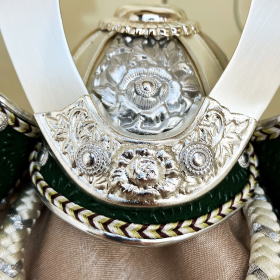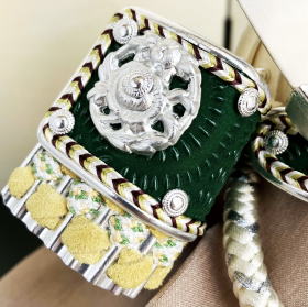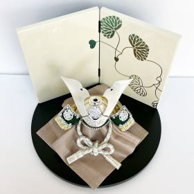 緑色にこだわり選んだ印伝革や本革威しが綺麗で高級感漂う銀兜がよく映えます。